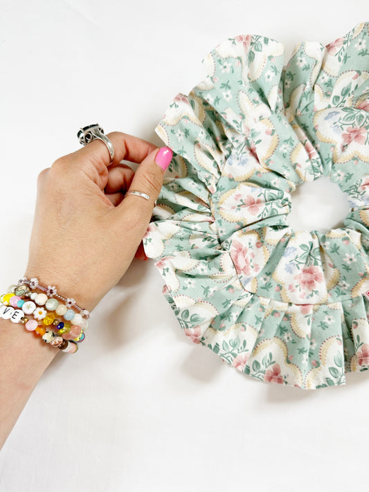 Oversized frilly scrunchie in pink green vintage floral