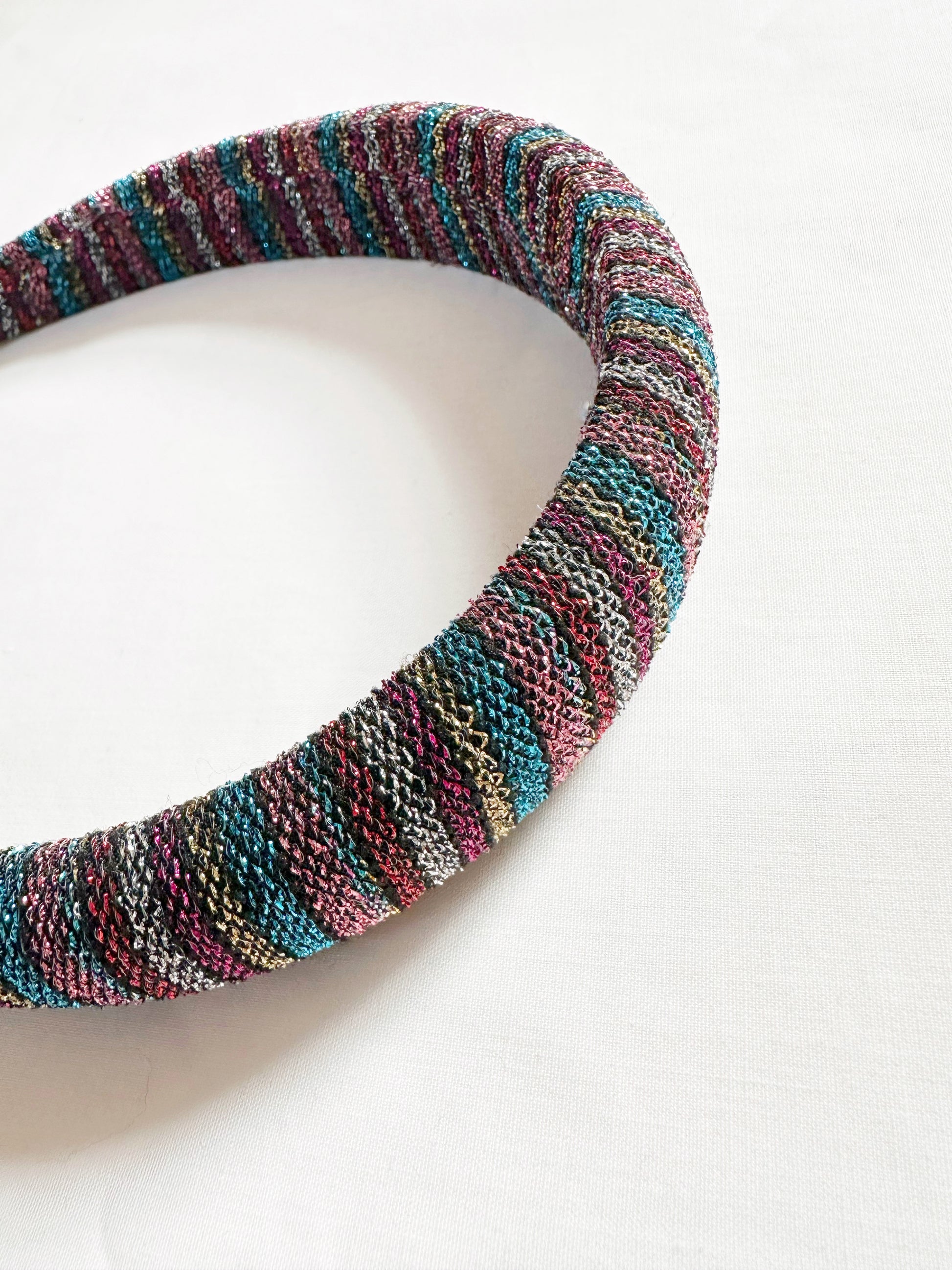 The Classic Headband. A flatter (less padded) version of the original fully padded style. They are super comfortable to wear (no digging in behind the ears!) This design has been handmade using a gorgeous sparkly stripe lurex.