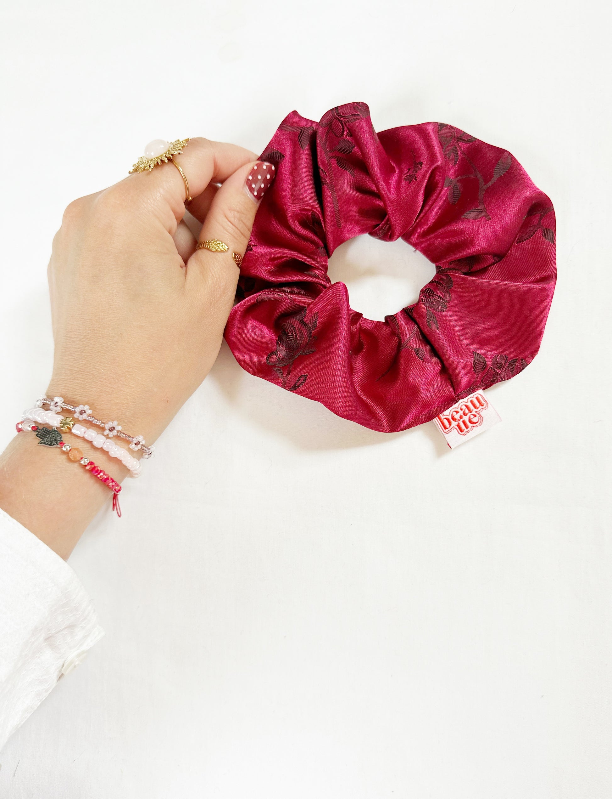 The OG/regular scrunchie is suitable for most hair types. This scrunchie has been handmade from secondhand silky trousers in a deep red with rose print.