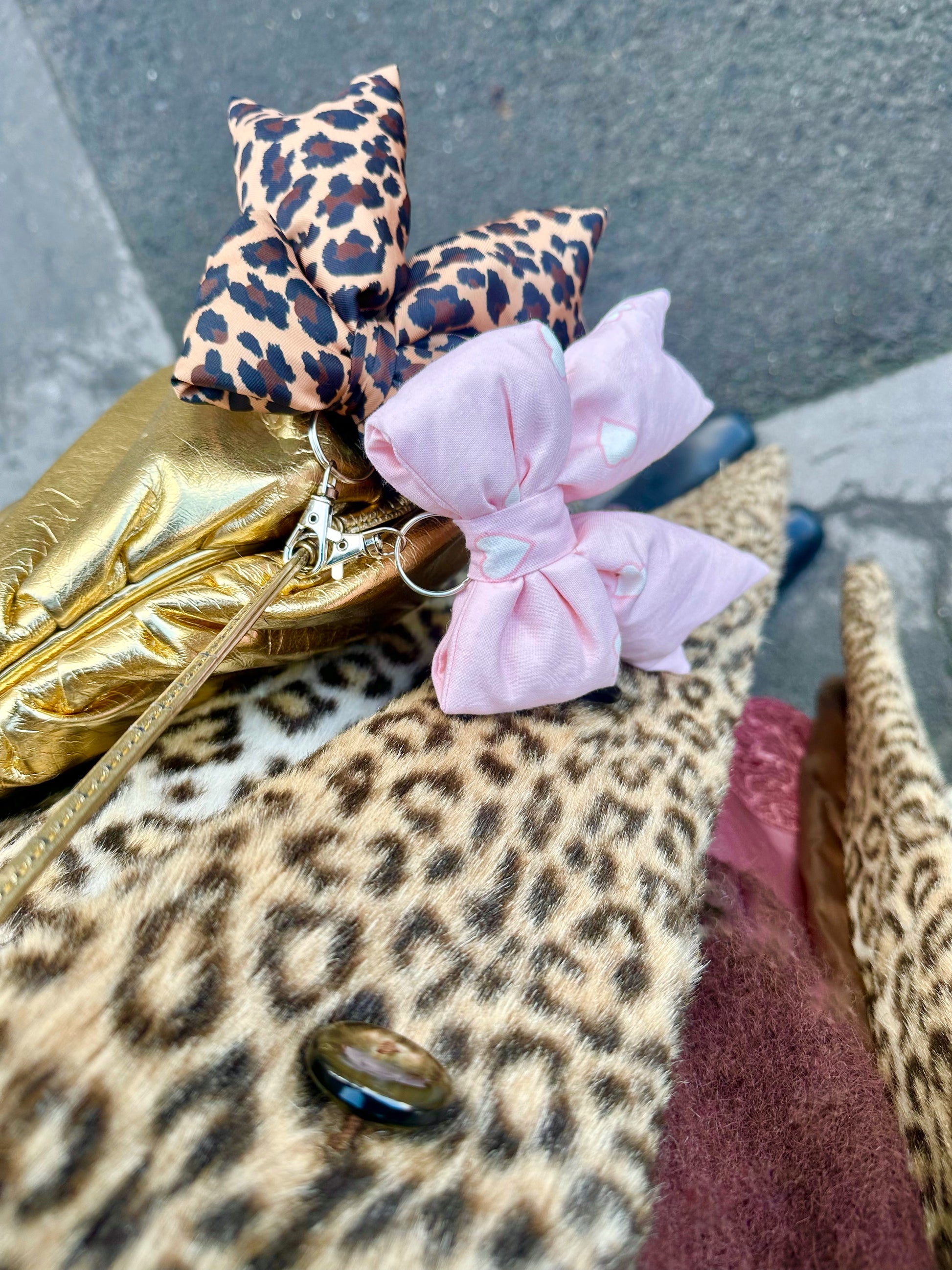 Embrace fun and nostalgia by accessorising your bags with these gorgeous playful bag charms, in a puffy bow shape. Each is handmade using preloved fabrics, and also stuffed with fabric offcuts too. They come attached to a little silver clip. This design is handmade from secondhand leopard print fabric.
