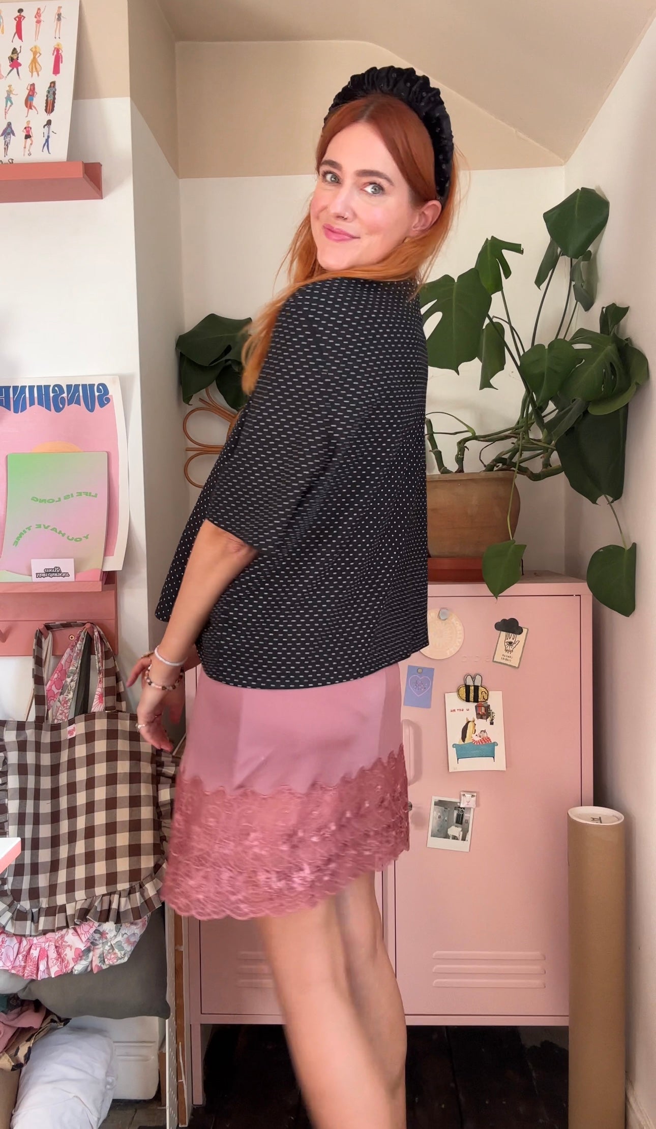 This super cute headband has a ruffled shape with slight padding, and is super comfortable to wear (no digging in behind the ears!) It has been handmade using a secondhand black velvet dress with sparkly polka dot details.